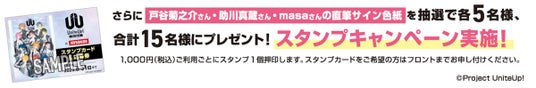 コラボドリンクご注文でお渡しするスタンプカードに、ご利用金額1,000円(税込)ごとにもらえるスタンプを5つ集めて応募すると、戸谷菊之介さん・助川真蔵さん・masaさんの直筆サイン色紙が各5名様、合計15名様に当たる、スタンプキャンペーンも実施します!