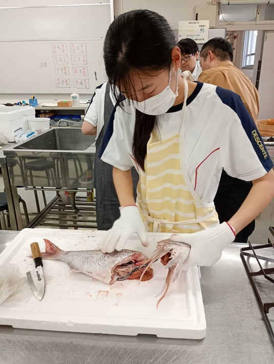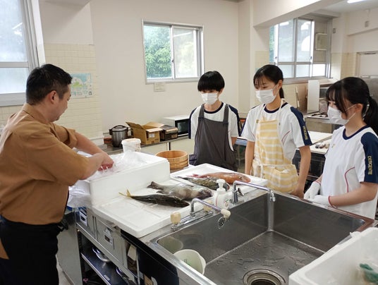 訪問した鳥羽磯部漁協直販センターには、いつも鳥羽市の離島から多くの魚が集まるそうです。この日は天候が悪く、種類も量も多くはありませんでしたが、マダイ、コショウダイ、クロダイを調達し、今、地域で獲れる魚で作る手こね寿司をイメージして仕入れを行いました。学校の調理室にて、岡田シェフのご指導のもと、生徒たちは初めて魚をさばく体験をしました。