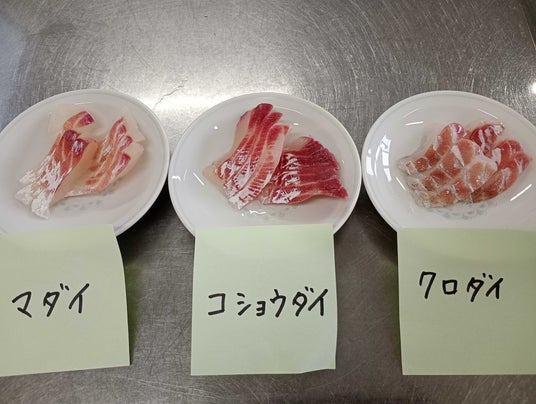 マダイ、コショウダイ、クロダイの食べ比べに始まった3日目。クロダイとマダイでは約4倍もキロ単価が異なることを聞き、味の違いも実感しつつ、獲れた魚がおいしく有効活用されるべきではと話をしながら調理が進みます。今回は、岡田シェフに持参いただいたカツオを使用して赤身魚で手こね寿司を作ったほか、市場で仕入れ、生徒自身でさばいたタイ3種を使ってレモンでさっぱりと仕上げた白身魚の手こね寿司が完成しました。来年度も後輩に引き継ぎたいプロジェクトであるとのことで、2年生の城山日歩さんにも参加いただきました。