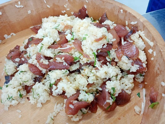 A:船上で酢飯と魚を混ぜ合わせるために「手でこねる」という調理法からだと思いますが、現代において観光地で郷土料理が提供されるにあたり、見た目や衛生面を重視するようになったことから、手でこねなくなったり、刺身を酢飯の上に乗せて提供したりするのが一般的になっています。