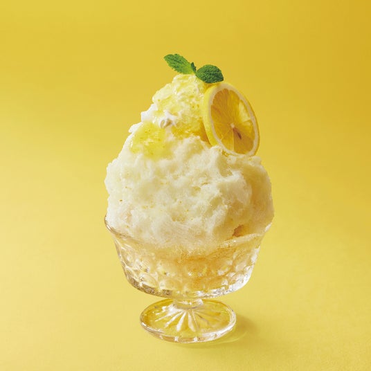 「天然水の削り氷」に、和紅茶のソースと檸檬とゆずのソースをかけ、ホイップクリームとゆずのジュレ、レモンスライスをのせました。甘酸っぱいレモンティーを思わせる味わいと、ゆずの爽やかな香りとほのかな苦みを感じる一品です。
