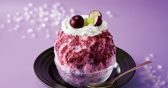「天然水の削り氷」に、ナガノパープルや巨峰などの黒ぶどうを使用した濃厚なソースと、練乳とミルクをブレンドしたソースをかけ、ホイップクリーム、シャインマスカットゼリー、黒ぶどうの果粒をのせました。さらに、氷の中心にはカスタードクリームと砕いたシナモン風味のクッキー、黒ぶどうの果粒を忍ばせています。食べ進めるにつれて、食感と味わいの変化を楽しめる、贅沢な削り氷です。