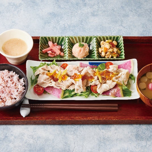 ポン酢ジュレとゆずの果皮をのせた豚肉の冷しゃぶをメインに、とろろ、副菜3品、ごはん、お味噌汁をセットにしたお膳です。