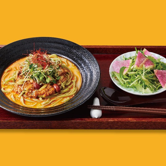 抹茶の原料であるてん茶を練り込んだ生パスタを、冷製担々麺風にアレンジしました。米糀ミルクベースのピリ辛スープに、3種の豆(青大豆、白いんげん豆、きんとき豆)と肉みそ、柚子の果皮、4種の薬味(みょうが、万能ねぎ、かいわれ大根、大葉)、糸唐辛子をのせました。ミニサラダがセットで付きます。