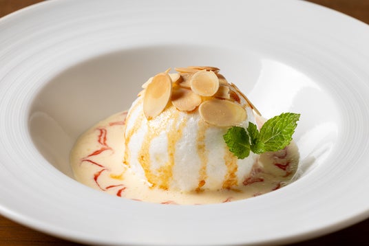 ■ウッフアラネージュ ジャン-フィリップのイメージで■ふんわりと仕上げたメレンゲに、香ばしいアーモンドとバニラ香るクレーム・アングレーズを添えて。フランスの伝統菓子「ウッフ・ア・ラ・ネージュ」を、ジャン-フィリップ ポンスの軽妙な作品世界にインスピレーションを得てアレンジしました。皿の上に広がる模様やフォルムは、まるで彼の筆遊びを味に写したかのよう。ディナーのデザートとしてご提供いたします。アートとデザートの軽やかな対話をお楽しみください。