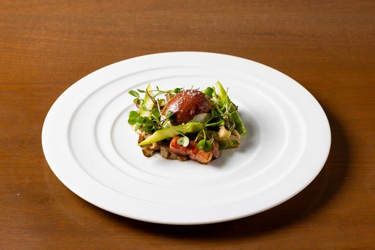 ■ ジャン-フィリップ ポンスの“皮肉と詩情”が交錯するアートに合わせて構成した、温冷コントラストの前菜。しっとりとした茸のフリカッセ、ハーブ香るグリーンサラダ、そして半熟卵が絶妙に溶け合い、ひとさじごとに味覚の物語が展開します。