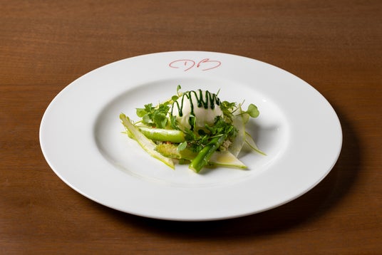 ■ ジャン-フィリップ ポンスの“ユーモアと知性”を感じる世界観に着想を得た前菜。半熟卵にまろやかなマヨネーズを添え、アスパラやセロリなど夏野菜をクスクスでまとめたタブレとともに。爽やかさとコクが共存する一皿は、彼のアートのように軽妙で奥深い余韻を残します。