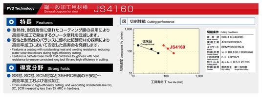 そこで弊社は、従来品よりも低抵抗な形状を持つ「LFブレーカ」付きインサートと、軟鋼や炭素鋼の切削に優れる新インサート材種JS4160を開発し、この度発売いたします。