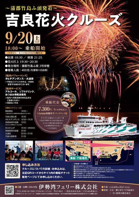 愛知県田原市と三重県鳥羽市を運航する伊勢湾フェリー株式会社(本社:鳥羽市)では、西尾市吉良町で開催される第35回吉良花火大会において、昨年大好評につき、本年も蒲郡市竹島埠頭発着の花火観覧クルーズを運航いたします。