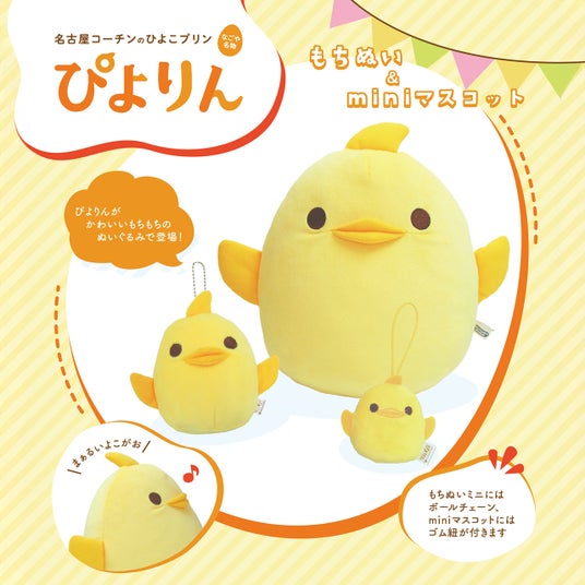 オリジナル商品の企画・制作・販売を軸に、企業・組織のトータルブランディングを手掛ける株式会社ヘソプロダクション(本社:大阪市福島区・代表取締役:稲本ミノル)は、ジェイアール東海フードサービス株式会社(本社:愛知県名古屋市、代表取締役社長:岩下賢一)のオリジナルスイーツ「ぴよりん」のもちもちぬいぐるみ「ぴよりん もちぬい&miniマスコット」各種を発売いたします。