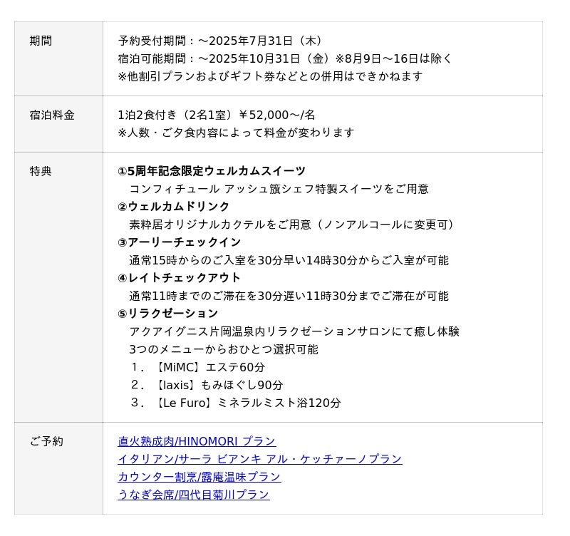 株式会社アクアイグニス(本社:東京都中央区、代表取締役:立花哲也)が運営する、アクアイグニスの別邸「湯の山 素粋居(そすいきょ)」は、2025年7月で開業から5年の節目を迎えます。