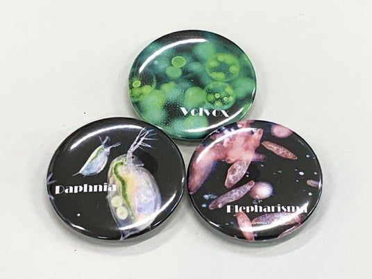 プラネタリウムを備える豊橋市視聴覚教育センター・地下資源館ではこれまで、星座をテーマにした缶バッジ(全12種)を販売していました。今回モチーフとなったのは同館で飼育している微生物たち。中でも「ボルボックス」と「ブレファリスマ」は、市内の小学4年生が校外学習「わくわく体験活動」で観察しているおなじみの生き物です。