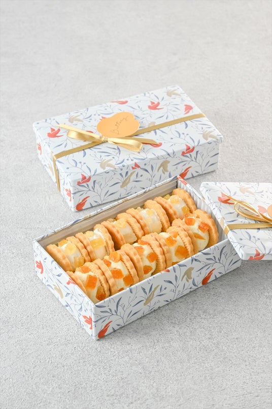 オリジナルデザインのクッキー缶を開くと、コロンとしたバターサンドがぎっしりと詰まっています。まるでモザイクガラスのようにキラリと可愛いバターサンドは、大切な方への手土産や夏ギフトにもおすすめです。