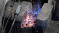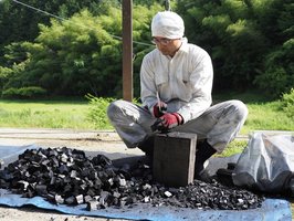 刀匠の福留房幸さん(40)が梅雨の晴れ間に炭を切っていた。長さ40センチほどの松の炭をナタで4~5センチ角にしていく。松炭は火力があり火持ちもするのでバランスが良く、昔から鍛冶仕事には松炭と相場が決まっている。大きいままではすぐに火力が上がらないので、刀匠が好みの大きさに切って使うのだ。