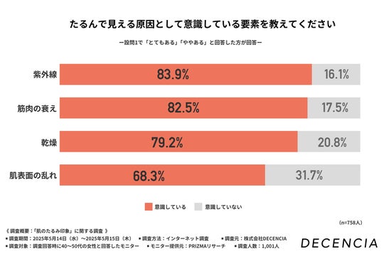 「たるんで見える原因として意識している要素」について尋ねたところ、『紫外線(83.9%)』が最多で、『筋肉の衰え(82.5%)』『乾燥(79.2%)』と続きました。