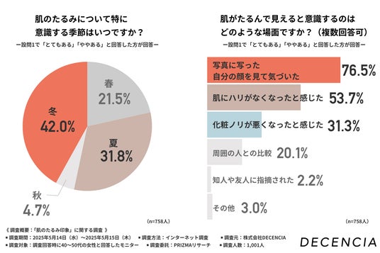 「肌のたるみについて特に意識する季節」について尋ねたところ、『冬(42.0%)』が最多で、『夏(31.8%)』『春(21.5%)』『秋(4.7%)』と続きました。