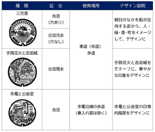 「三河港」のデザインは、豊橋市が世界に誇る国際貿易港「三河港」を中心に、朝日のなかを船が出港する姿から、人 ‧ 緑 ‧ 港 ‧ 町をイメージしており、車道(市道)&歩道のマンホールに使われています。