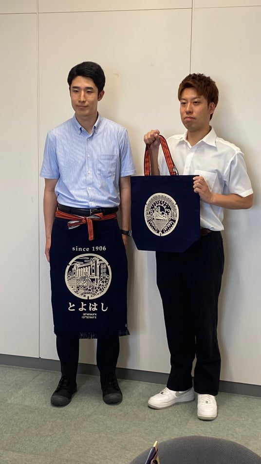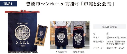 豊橋市を象徴するモチーフが描かれたご当地マンホールデザインが、綿の糸で厚く織られ、伝統的な生地にプリントされた、オリジナル前掛けとトートバッグが完成しました。