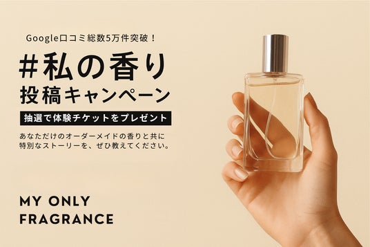 京都発のオーダーメイドフレグランス専門店「MY ONLY FRAGRANCE(マイオンリーフレグランス)」を展開する株式会社フレグランスプロジェクト(本社:京都府京都市、代表取締役:和田慎平)は、全国11店舗での調合体験を通じて寄せられたGoogleクチコミが累計5万件(2025年6月時点)を突破したことを記念し、2025年7月1日(火)より、感謝の気持ちを込めたSNS参加型キャンペーン「#私の香り 投稿キャンペーン」を開催いたします。