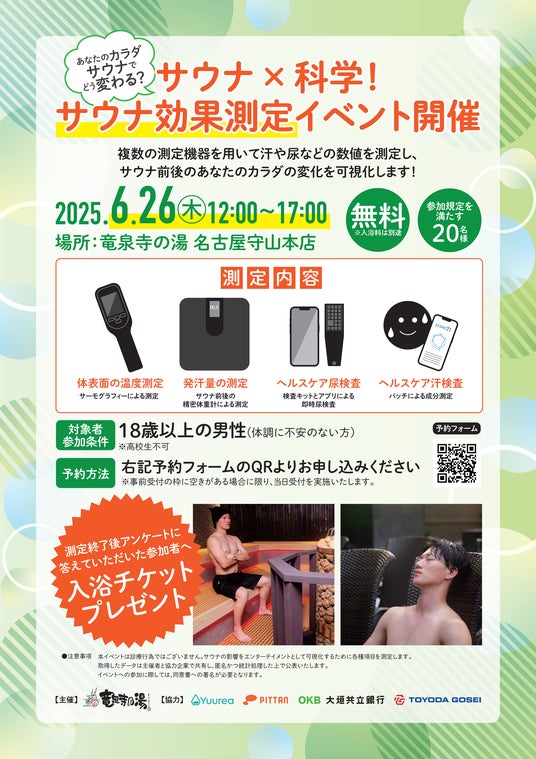 本イベントは、藤田医科大学 医療科学部 医療准教授の西垣 孝行 氏の監修のもと、オークランド観光開発が運営する「竜泉寺の湯 名古屋守山本店」において、6月26日(木)に開催されます。イベント参加者は、豊田合成が連携するスタートアップのユーリアや、神戸発のディープテック・スタートアップであるPITTANが開発した検査キットなどにより、サウナ前後の身体の変化を計測し、そこで得られた画像やデータを通じて、サウナの効果や身体への影響についての理解を深めます。参加者が得る新たな気づきや発見は、サウナに対する価値観の変化を促し、健康意識の向上やサウナ施設の利用促進につながることが期待されるため、各社は、今後もこうした取り組みを継続的に実施し、健康増進を促す新たなサービスの開発を目指します。