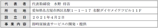 「すぐわかるを、もっと身近に」をスローガンに掲げ、尿から体の状態を即時解析する事を目的とし、2021年に東京大学との共同研究で立ち上がったヘルスケアスタートアップ。独自バイオマーカーの研究による解析・計測技術の開発、検出したデータを簡単にモニタリングできるスマートフォンアプリの開発、尿から解析した体の状態による日々のパフォーマンス改善サポートなどの研究開発を行っている。