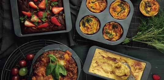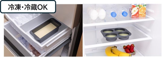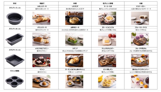 この度発売するのは、ラウンド型、パウンド型、スクエア型、マフィン型の4種類です。素材には、耐熱・耐冷性に優れ、高強度・高剛性も兼ね備えたLCP樹脂を採用。製菓型への要望で多かった「お手入れの楽さ」「オーブン・電子レンジどちらでも使える型がいい」「食洗機対応の方がいい」という声にお応えし、オーブン・電子レンジ・冷凍・冷蔵、そして食洗機での使用が可能です。