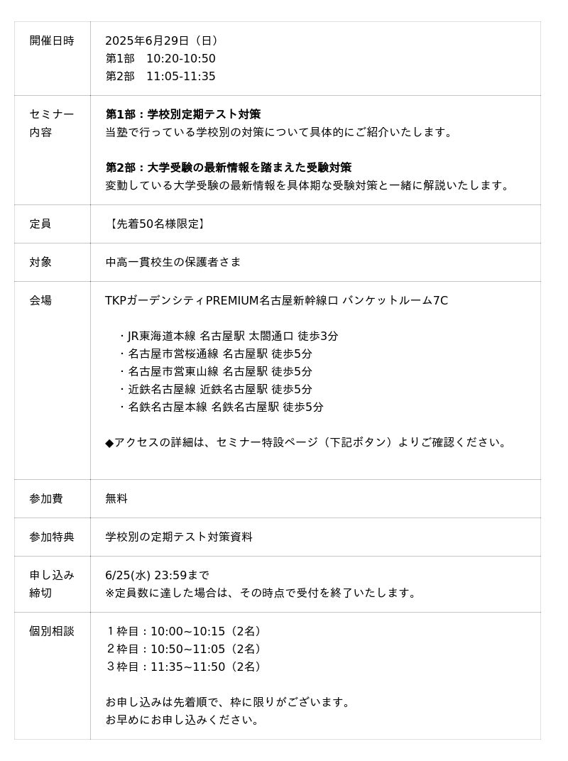 株式会社メイツ(本社:東京都新宿区 代表取締役:遠藤尚範)が運営する『中高一貫校専門 個別指導塾WAYS(以下、WAYS)』では2025年6月29日(日)に名古屋にて、中高一貫校に通う生徒・保護者さまを対象とした、学校別の対策法紹介セミナーを開催いたします。