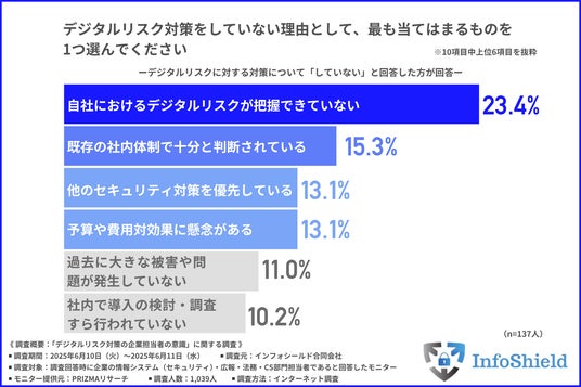 前の質問で『していない』と回答した方に、「デジタルリスク対策をしていない理由」を尋ねたところ、『自社におけるデジタルリスクが把握できていない(23.4%)』が最も多く、『既存の社内体制で十分と判断されている(15.3%)』『他のセキュリティ対策を優先している(13.1%)』『予算や費用対効果に懸念がある(13.1%)』と続きました。