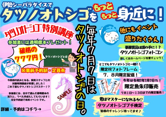 そして今年〔令和7年7月7日〕トリプルセブンの記念イヤーを迎えるにあたり、伊勢シーパラダイスでは、「タツノオトシゴの日」特別イベントを7月1日(火)から開催いたします。