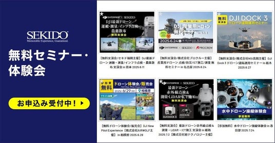 セキドでは、より多くの方にドローンを使った撮影や業務効率の改善を実現していただくため、ドローンや関連ソリューションをご紹介する無料セミナーやイベントを定期的に開催しております。今後もオンラインや全国各地での開催を予定しておりますので、ご興味をお持ちのイベントにはぜひお気軽にご参加ください。