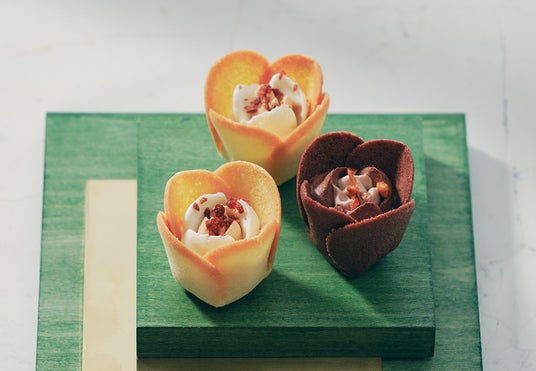世界中から選び抜いたフランス産発酵バターが香ばしいラングドシャクッキー。チューリップの花びらのように繊細で軽やかに焼き上げました。北海道産ミルクの生食感ショコラクリームをバラのように美しく絞り、隠し味には塩味のパイを。