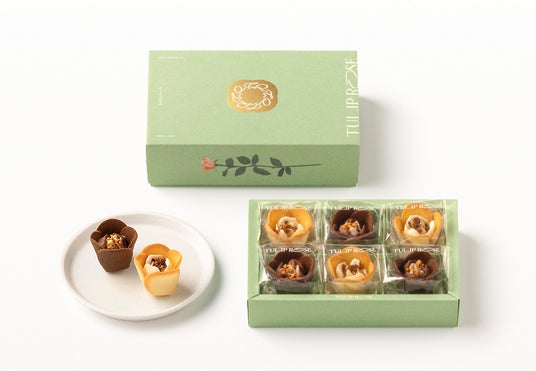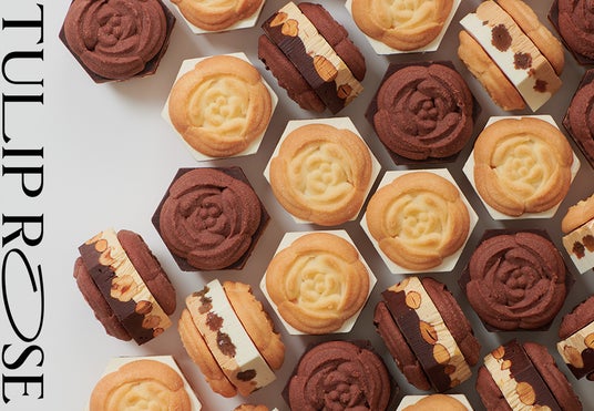 チューリップの中にローズが咲いたような美しい姿と 甘い香りとろける優しい味わいで愛され続けるブランド代表作『チューリップローズ』。チューリップの花びらのように繊細で軽やかに焼き上げたラングドシャ生地は、フランス産発酵バターを使用して格別の香ばしさに。バラのように美しく絞った生食感ショコラクリームは、クリーミーなコクのある北海道産ミルクを採用し濃厚な美味しさに進化しました。ラングドシャクッキーの花びらを1~2枚摘みとると食べやすくなり、一層おいしくお楽しみいただけます。