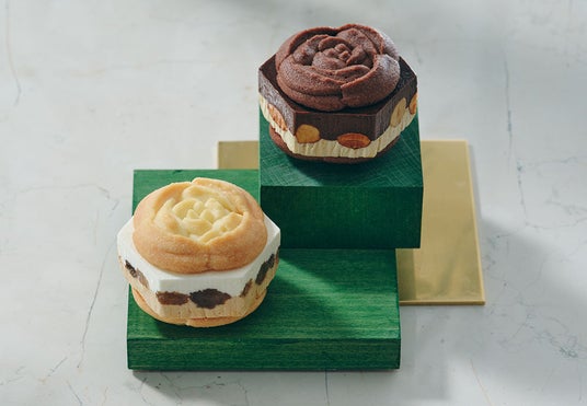 各日90箱限定・時間限定販売(※)のとっておきのデザート『フレッシュ・チューリップローズ』。代表作チューリップローズが もしも“生仕立て”に進化したら? そんな理想を形にした、贅沢にとろける極厚バターサンドです。世界中から選び抜いた厳選素材で生まれ変わった代表作『チューリップローズ』の濃厚なコクや芳醇な美味しさはそのままに、ジューシーな味わいや多彩な食感を惜しみなく加えた贅沢2層重ねの生仕立てにグレードアップさせました。仕上げに『チューリップローズ』を真上から眺めた姿をかたどった、美しいサブレでサンド。“ミルクバターレーズン”と“プラリネチョコレート”2味のセットです。