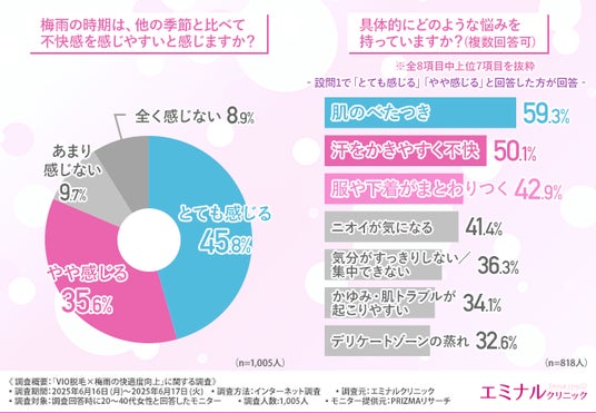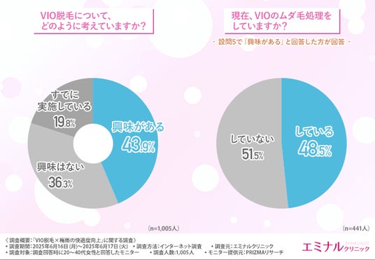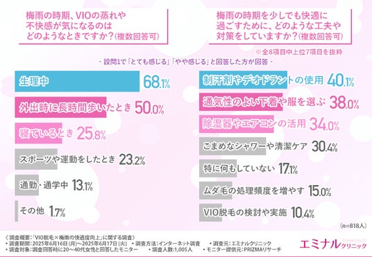 そこで今回、医療脱毛の「エミナルクリニック」は、20~40代の女性を対象に、「VIO脱毛×梅雨の快適度向上」に関する調査を実施しました。