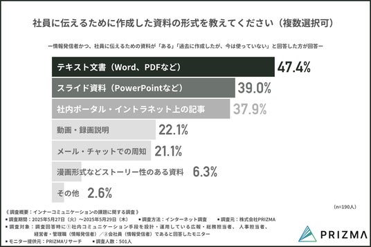 では、実際に運用されている社内資料にはどのような形式のものが多いのでしょうか。資料の形式として多く挙げられたのは、『テキスト文書(Word、PDFなど)(47.4%)』『スライド資料(38.9%)』『社内ポータル・イントラ記事(37.9%)』でした。