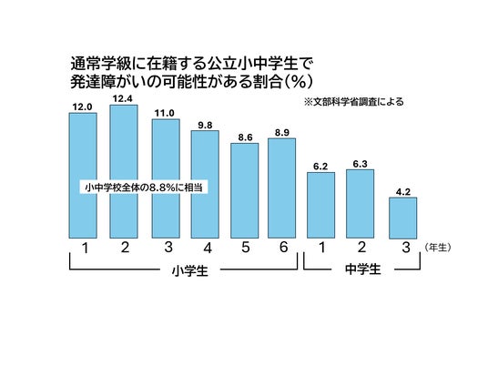 文部科学省(2022)の実態調査では、国内の小中学生の約8.8%──およそ11人に1人が、診断の有無に関わらず、発達や行動面で何らかの特性を有し、支援が必要と