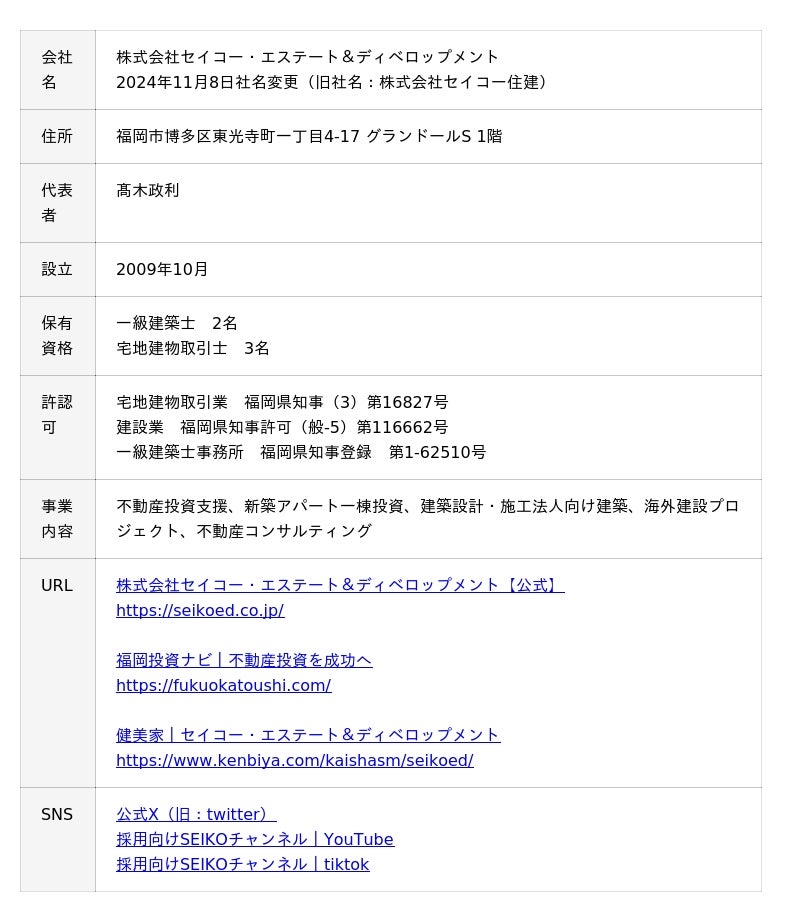 セイコー・エステート&ディベロップメントは、福岡を中心に新築アパート一棟投資の企画・土地仕入れ・建築・融資支援・管理までワンストップで支援。初めて不動産投資をする方に向けて情報格差をなくすべく『福岡投資ナビ』の運営や定期的に新築アパート経営を分かりやすく伝える無料セミナーも開催しています。