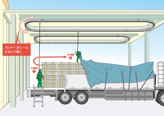 直線レールとカーブレールでO字状にレールを設置した納まり。荷台上の荷物の周りを安全に移動できます。O字のレール形状により荷台上で360°移動でき、シートを被せるなどの作業が可能です。