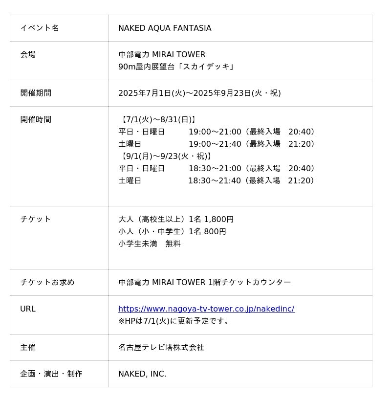 株式会社ネイキッド(英語表記:NAKED, INC. 、所在地:東京都渋谷区、代表:村松亮太郎)は、名古屋テレビ塔株式会社(所在地:愛知県名古屋市)が運営する「中部電力 MIRAI TOWER」の90m屋内展望台「スカイデッキ」にて、2025年7月1日(火)~2025年9月23日(火・祝)の期間に開催されるプロジェクションマッピングショー『NAKED AQUA FANTASIA』の企画・演出・制作を手がけています。