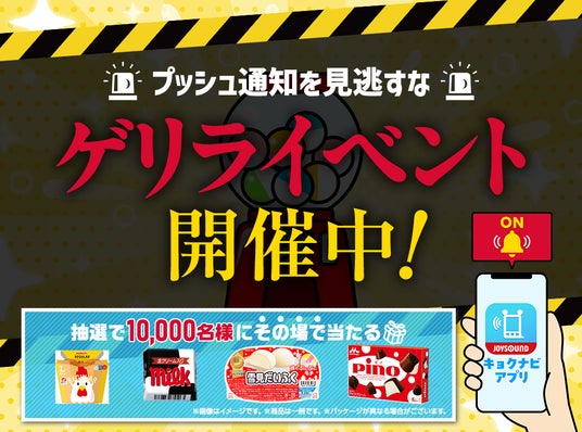 スマホがカラオケのリモコンになるアプリ「キョクナビJOYSOUND」アプリでは、「#推しリクエスト王」の募集期間中、抽選で10,000名さまにデジタルギフトが当たるゲリライベントを開催します。参加方法は、アプリのプッシュ通知をONにするだけ。期間中に2回、スピードくじに参加できるプッシュ通知が届き、そこからアプリを開くことでスピードくじに参加できます。ゲリライベントを楽しみながら、リクエストしたい1曲を探してみてはいかがでしょうか。