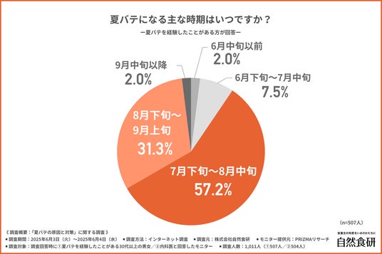 「夏バテになる主な時期」について尋ねたところ、『7月下旬~8月中旬(57.2%)』と回答した方が最も多く、次いで『8月下旬~9月上旬(31.3%)』となりました。