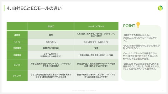 本資料では、カスタマイズ性の高い自社ECサイトと、初心者の方でも始めやすいECモールを比較し、ご紹介しています。