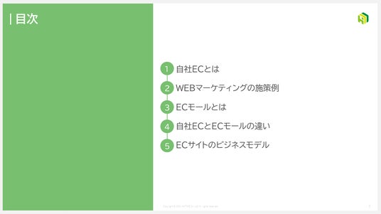 本資料では、このほかにも自社ECサイトでのWEBマーケティングの施策例や、ECサイトのビジネスモデルなどについても掲載しています。