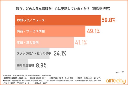 「現在、どのような情報を中心に更新しているか」と尋ねたところ、『お知らせ/ニュース(59.8%)』と回答した方が最も多く、『商品・サービス情報(49.1%)』『実績・導入事例(41.1%)』となりました。