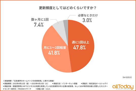 株式会社オールトゥデイ(本社所在地:埼玉県さいたま市)は、HPでビジネスの効果を実感している広告業界の中小企業の経営者、もしくはHP制作担当者を対象に、「広告業界のホームページの効果実感」に関する調査を実施しましたので、その結果を公表します。
