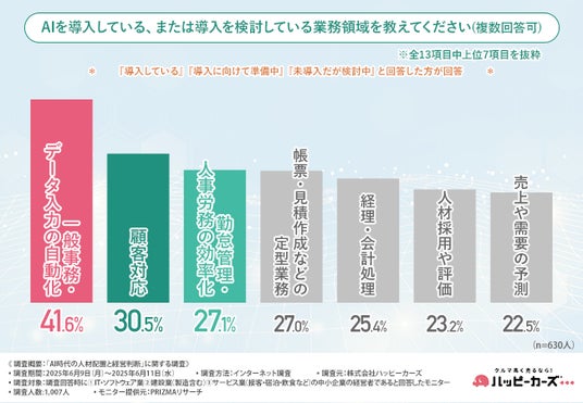 「AIを導入している、または導入を検討している業務領域」について尋ねたところ、『一般事務・データ入力の自動化(41.6%)』が最も多く、『顧客対応(30.5%)』『勤怠管理・人事労務の効率化(27.1%)』と続きました。
