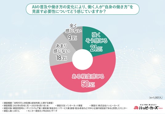 「AIの普及や働き方の変化により、働く人が“自身の働き方”を見直す必要性を感じるか」について尋ねたところ、約7割が『強くそう感じる(21.3%)』『ある程度感じる(50.5%)』と回答しました。