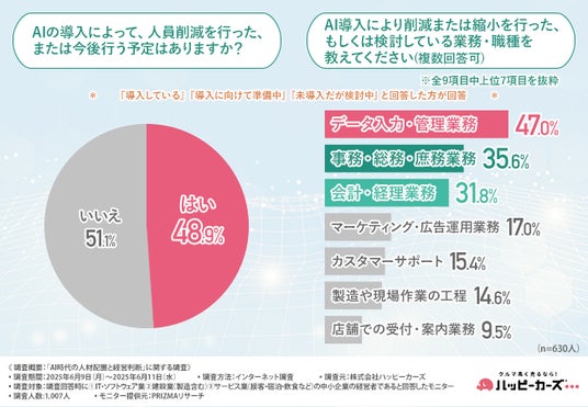 AIが導入されている業務領域は、一般事務やデータ入力などの定型業務が中心であり、これらは同時に人員削減の対象ともなっています。実際に、AI導入によって人員削減を行った、または今後行う予定の企業が半数近くに上ることから、業務効率化とコスト削減を重視した経営判断が背景にあると考えられます。