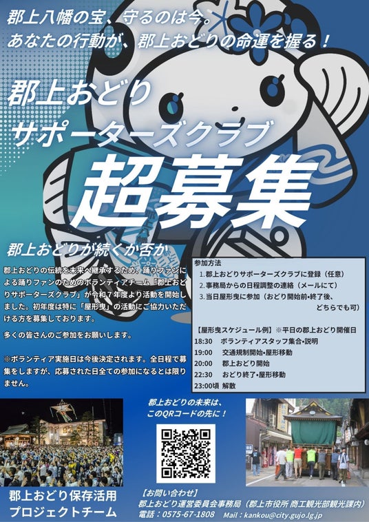 サポーターズクラブの発足にともない、郡上市内外を問わず、新規ボランティアメンバー(高校生以上)を募集します。郡上おどりは地元の人だけでなく、市外や海外からの多くの観光客からも愛され、だれでも参加し、楽しむことができる唯一無二の伝統行事です。
