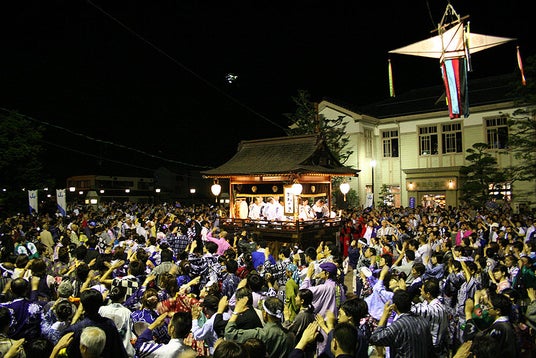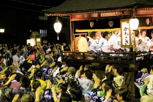 「屋形曳き(やかたひき)」郡上おどりは一般的な盆踊りと同様に大勢の踊り手が大きな輪を作り、踊りの種類ごとに右回りや左回りが決まっていて、踊りが変わるときに回転の方向が変わります。特に、お盆の4日間の「徹夜おどり」では、七重八重の輪が広がり、郡上おどりならではの大きな絵巻が繰り広げられます。
